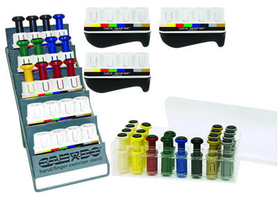 Dig-Flex Multi fingerknappar finns tillgängliga i 8 nivåer/motstånd: brun (ultra lätt), gul (extra lätt), röd (lätt), grön (medel), blå (hårt), svart (extra hårt), silver (ultra hårt), guld (extremt hårt).